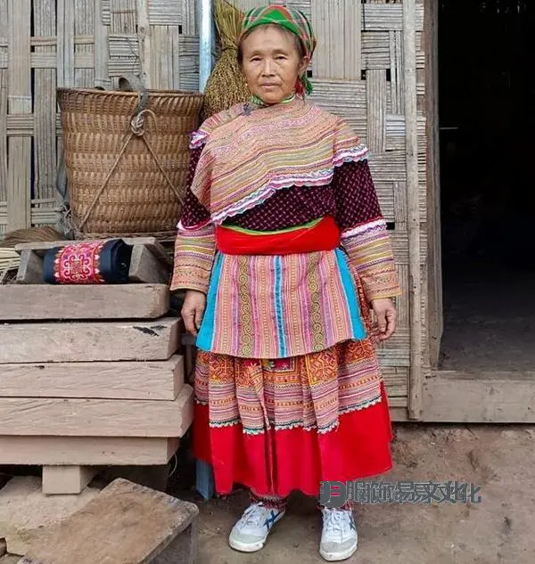 图案和图案主要用红、蓝、黄、白线绣制而成。其中,红色占主导地位,既作为中间底色,又创造主要图案,与蓝、黄或白色相结合,构成图案和图案。为服装营造出引人注目且令人印象深刻的感觉。