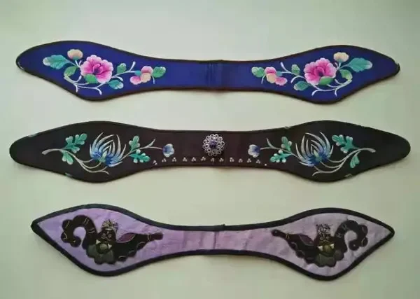 清末民初汉族花鸟几何纹珠绣抹额,长38厘米,宽6.5厘米,黑素缎为面,灰蓝色棉布为里,边缘镶缝黑素绸绲边,绲边内用厚不足一毫米的彩色料珠满绣花鸟蝶几何纹样,其中抽象的花鸟蝶纹样居中,规矩整齐的几何纹样沿外,纹样布局有疏有密,料珠大小均匀、排列紧密规整,色彩鲜艳亮丽,体现出制作者高超的手工技艺及古人利用小件配饰传达美好愿望的心理。