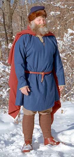我一直想知道将斗篷重叠在右臂上而不是中间,是否真的很重要。在最近的一场暴风雪中,我有机会对其进行测试。斗篷偏移后,匆忙抓住某物(在本例中是飞行中的射弹)要容易得多。当中间重叠时,斗篷总是会妨碍。 斗篷可以刺绣,或者用平板编织的辫子装饰。通常,它们挂在膝盖和脚踝之间的某个位置,具体取决于主人的财富。 传说中讲述了更长的斗篷,称为slæður,长到拖在地上。埃吉尔从他的朋友 Arinbjörn 那里收到了一件礼物(《埃吉尔传奇》,第 68 章),它是丝绸制成的,上面绣有金色,前面有金色纽扣。当埃吉尔的儿子后来未经允许穿上了它,并将其退回时,下摆已经脏了,埃吉尔非常不高兴。 如下所述,女性有时会穿着拖在地上的衣服。当弗洛西作为法律解决方案的一部分被给予长衣时(Brennu-Njáls saga,第 123 章),他认为长衣是一种侮辱,表明他是一名女性。 |