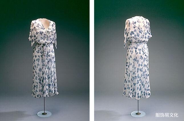 浅色外套连衣裙利用了对比色。它假装是由两部分组成,一件外套和一件连衣裙,但这是欺骗性的,因为“连衣裙”只是一块缝在外套侧缝上的布料,作为前片。与 20 年代更加宽松、年轻的理想女性相比,20 世纪 30 年代的理想女性年龄稍大、更加成熟、更加谨慎。