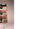 绿色和黑色格子斜纹毛茸茸羊毛大衣。宽挂领,背面剪裁有半圆形翻盖。背面采用对角线切割,中间有一条接缝。终生接合处紧密缝合。斜插袋和腰带。黑色光泽棉质衬里。