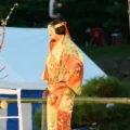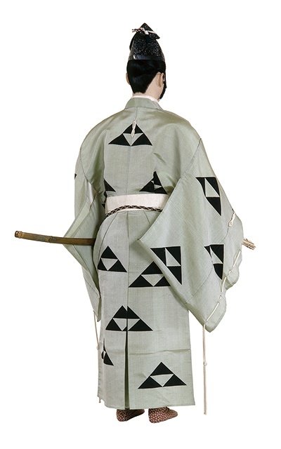 此人头戴1999年天武天皇制定的漆冠,身着1913年圣旨规定集会当天使用的腋下缝锦袍,系着长绳。袍子墨绿色是。也就是说,内衣是系着的,系在左边,用结或长绳系住,穿着白色裤裙。