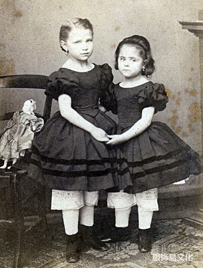 艾尔玛和克拉拉·萨拉莫,六岁和四岁(1863 年)两个来自佩皮尼昂商人资产阶级的小女孩,穿着两件一模一样的短袖连衣裙。小女孩穿的裙子是露出来的下装和裤子。 摄影日耳曼,佩皮尼昂。 |