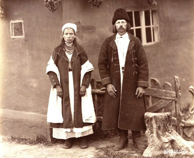 这对夫妇来自布罗迪南部的皮迪尔齐村。再次注意简单的大衣,采用更南方风格的剪裁,带有多个角撑板。