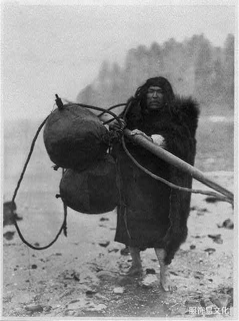 下雨天,除了毯子外,他们还戴一顶用云杉根编织的圆锥形帽子,帽子结构紧凑,可以防水,肩上还披着一张熊皮。即使有衣服穿,他们的着装也不讲究,偶尔会看到头戴帽子、脚穿靴子、身上只盖着毯子游行。