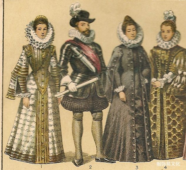 女性的服装包括开叉袖子的高裙、大量带有金属末端的领带、紧身上衣、领子和饰有珍珠线和羽毛的帽子。