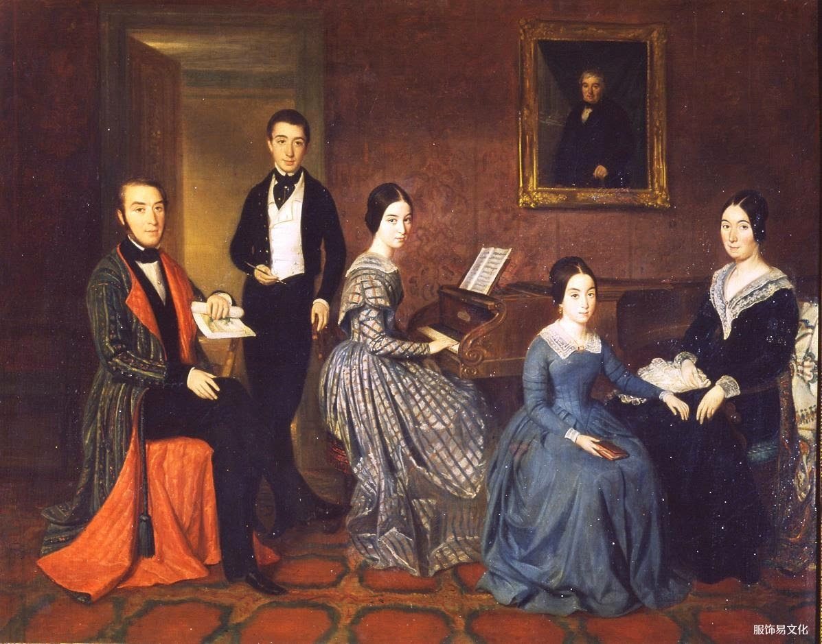我们在肖像中看到了日常的服装,因此我们区分了1840 年浪漫服装的朴素常规类特征:蝴蝶结、对称、素色裙子几何印花。钢琴前的年轻女子展示了格子、肩饰。何塞·埃斯帕尔特(José Espalter),弗拉克尔家族,马德里,浪漫主义博物馆。