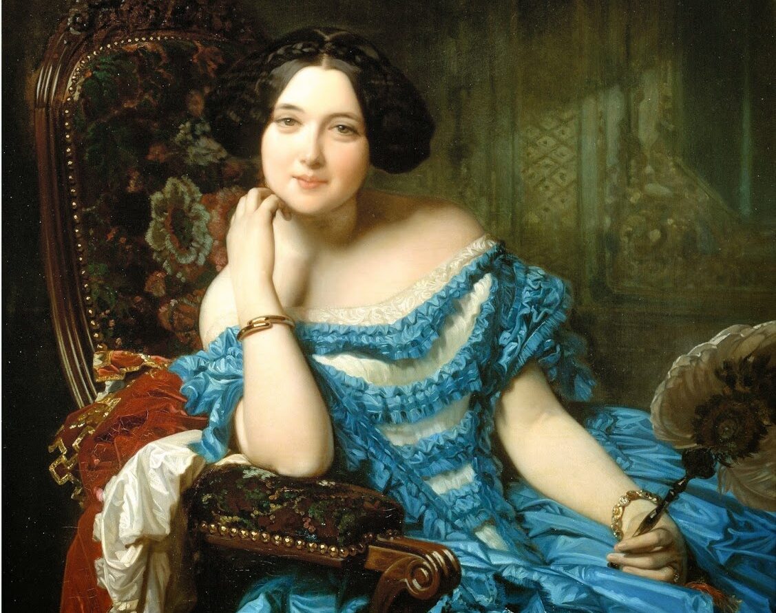 令人惊叹的伯塔(berta)连衣裙和半透明的绿色网纱。FX Winterhalter,玛丽·尤金妮皇后和她的侍女们,1855 年贡比涅城堡