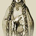 - 她还穿着长斗篷和当时已始做成尖头的封闭式鞋子。鞋子上系着色带,像鞋一系在脚踝上,露出脚的形状。