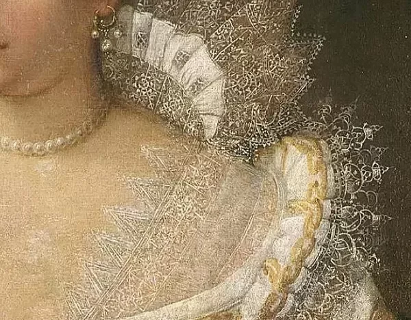 不规则褶皱亚麻衣领,荷兰北部,约 1615-35 年(via)。“早期的磨石褶皱上浆后带有规则的褶皱。然而,这个例子更宽松,也更不整洁。这种褶皱在 1615 年至 1635 年左右受到年轻时尚男士的青睐。这是世界上唯一幸存的褶皱褶皱。” – 荷兰国立博物馆网站
