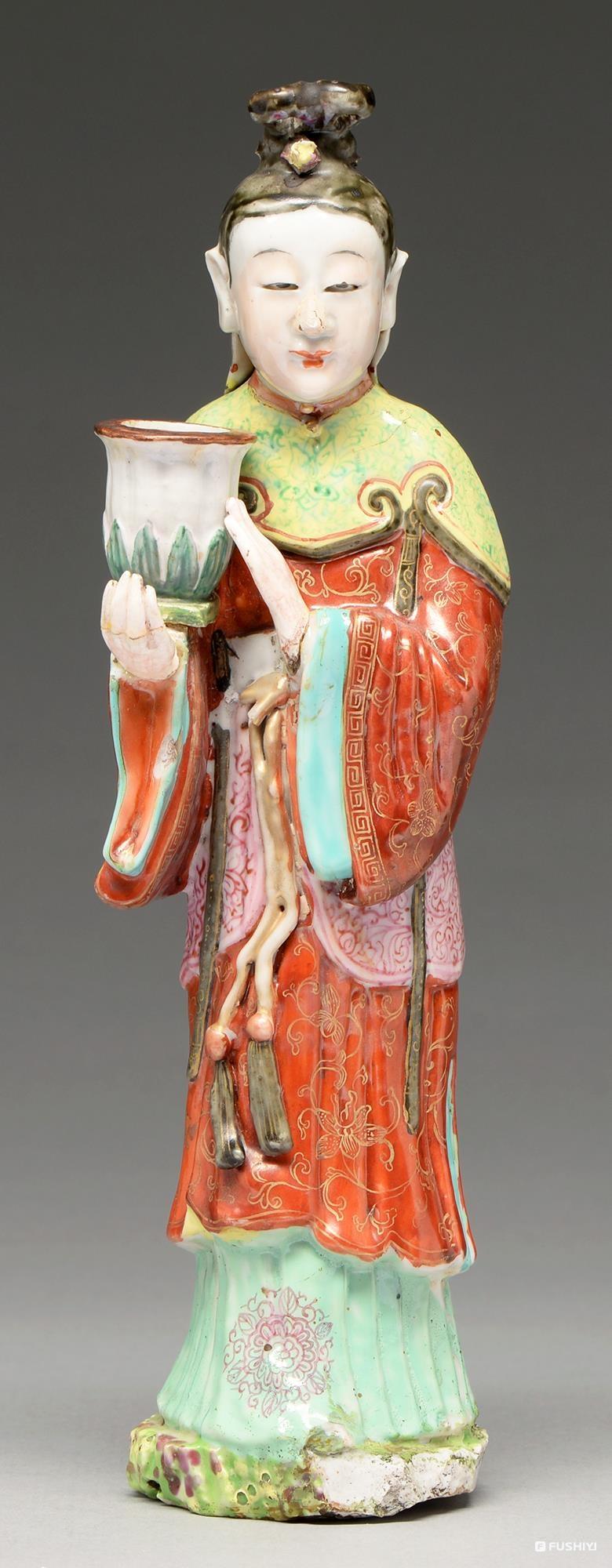 19 世纪中国粉彩人物香炉,身穿华丽的镀金珊瑚红、粉红色和绿松石色长袍,高 30 厘米,
