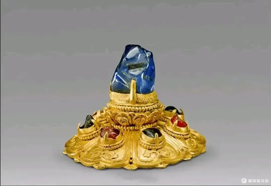 帝王的帽顶则常用大块宝石作为嵌饰。到了明中期,官员的帽子上也可使用宝石帽顶,记录严嵩父子被抄家产的《天水冰山录》里列有“帽顶”一项,共计三十五个,除金镶玉帽顶一个和金镶珠帽顶三个外,其余都是金镶宝石或珠宝帽顶。这说明洪武初期确立的帽顶制度已不再严格执行,官员可根据自身财力制作或购买各种宝石帽顶。