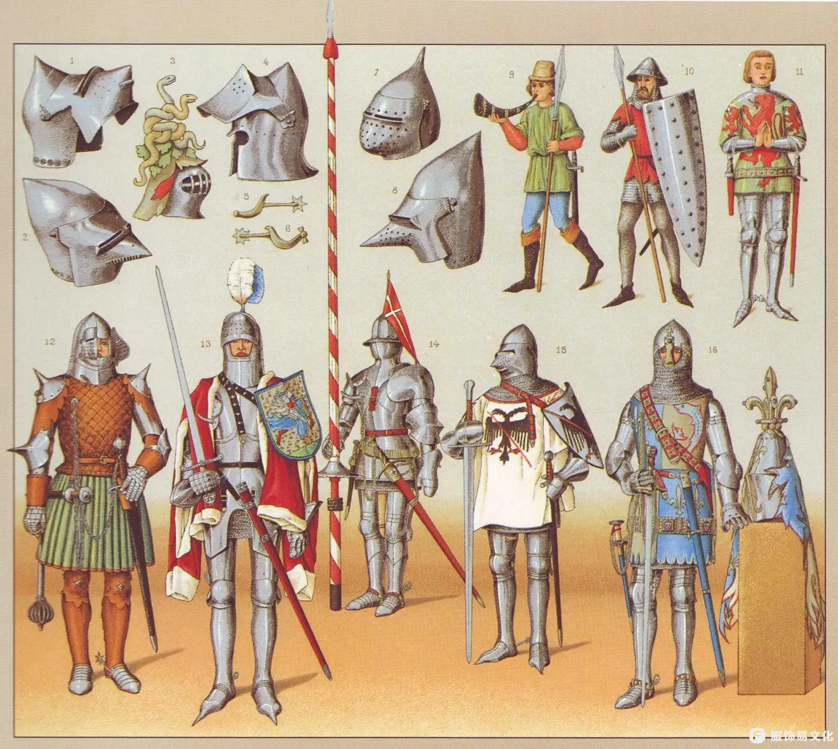 随着军事技术的进步和新战术的出现,锁子甲逐渐被板甲取代。然而,板甲重量的增加也催生了一种新的趋势。重骑兵等突击部队仍然穿着厚重的盔甲,但一些骑兵和大多数步兵为了提高机动性,开始穿着较轻的盔甲。1.1、2、4、7 和 8 号头盔。4 号和 7 号头盔为英式,可追溯至 14 世纪末。