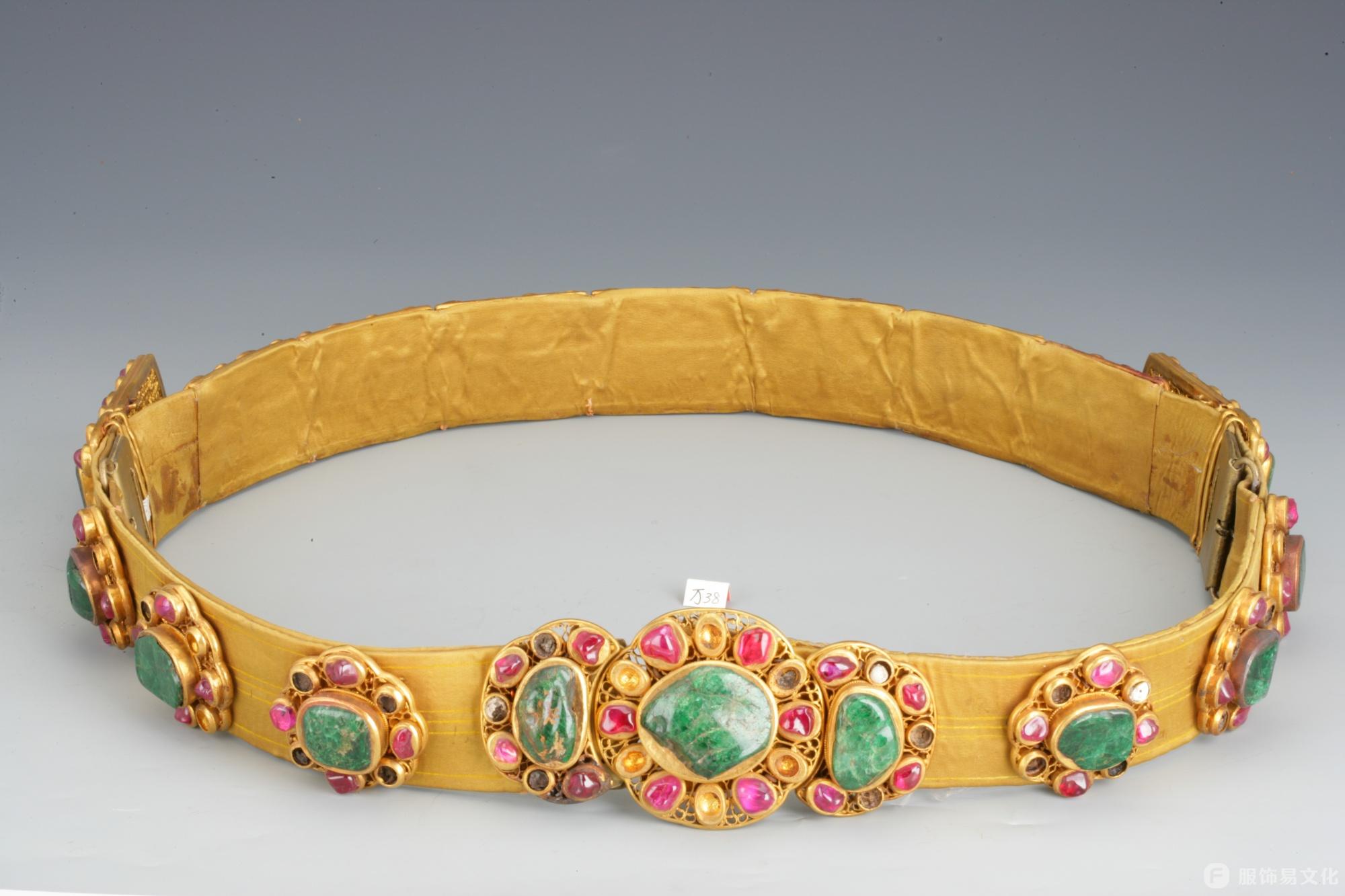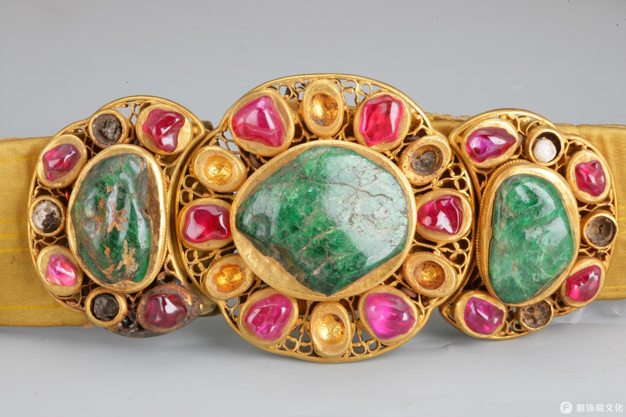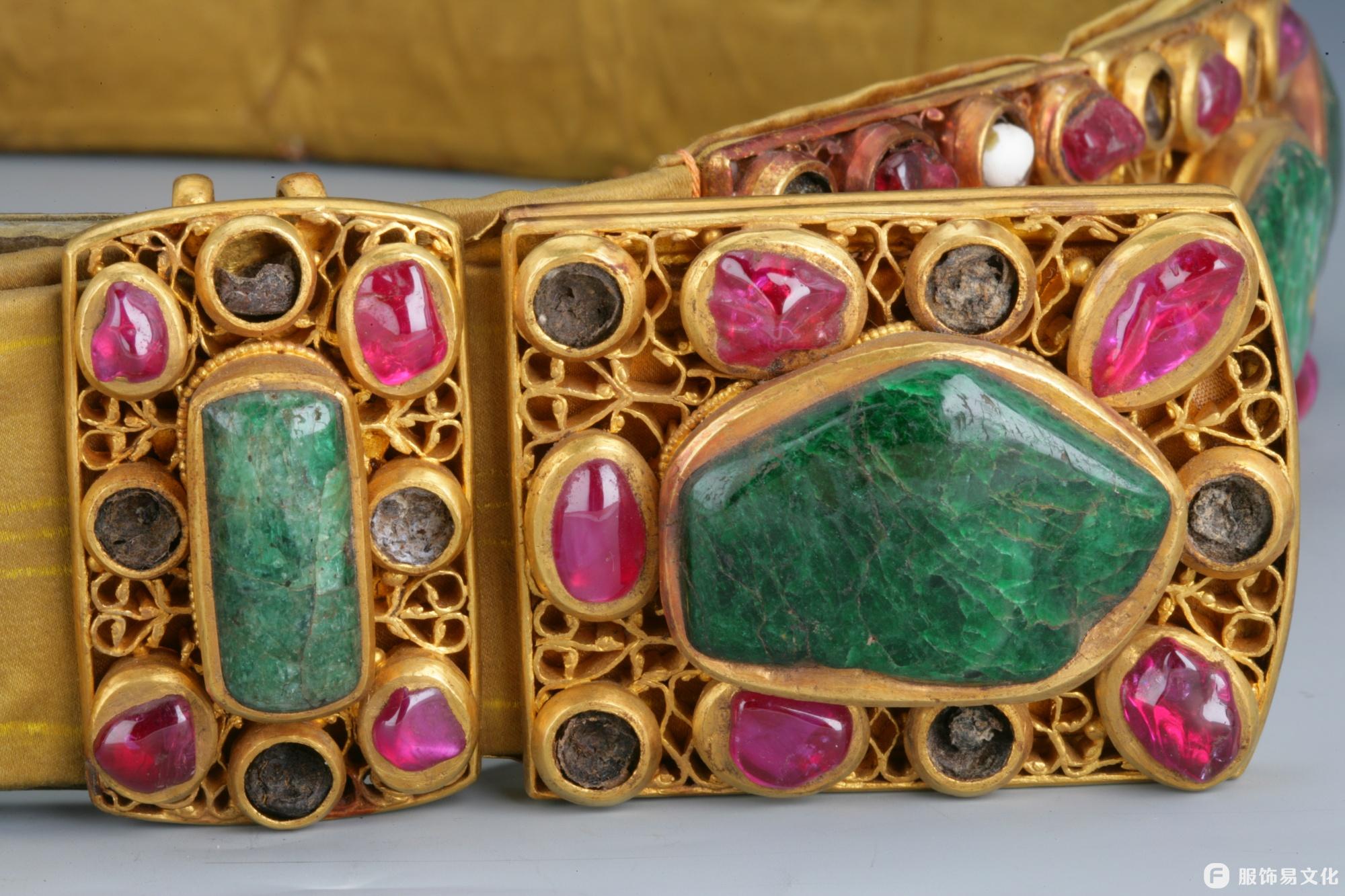 大碌带的核心装饰是带上缝缀的20件嵌宝金饰件,这些金饰件的形制与明代玉革带的玉饰件保持一致,工艺精湛、用料奢华。每件金饰件均以金托为底,托内用扁金打造出缠枝花纹样,缠枝纹线条流畅、缠绕有序,尽显明代金银工艺的高超水准;金饰件中心均镶嵌1块祖母绿,色泽浓郁、质地温润,四周则环绕镶嵌石榴籽红宝石与珍珠,红绿相映、珠玉点缀,整体呈现出富丽堂皇的皇家气派。